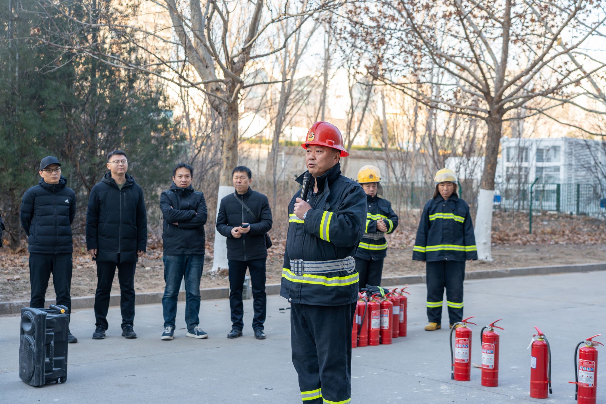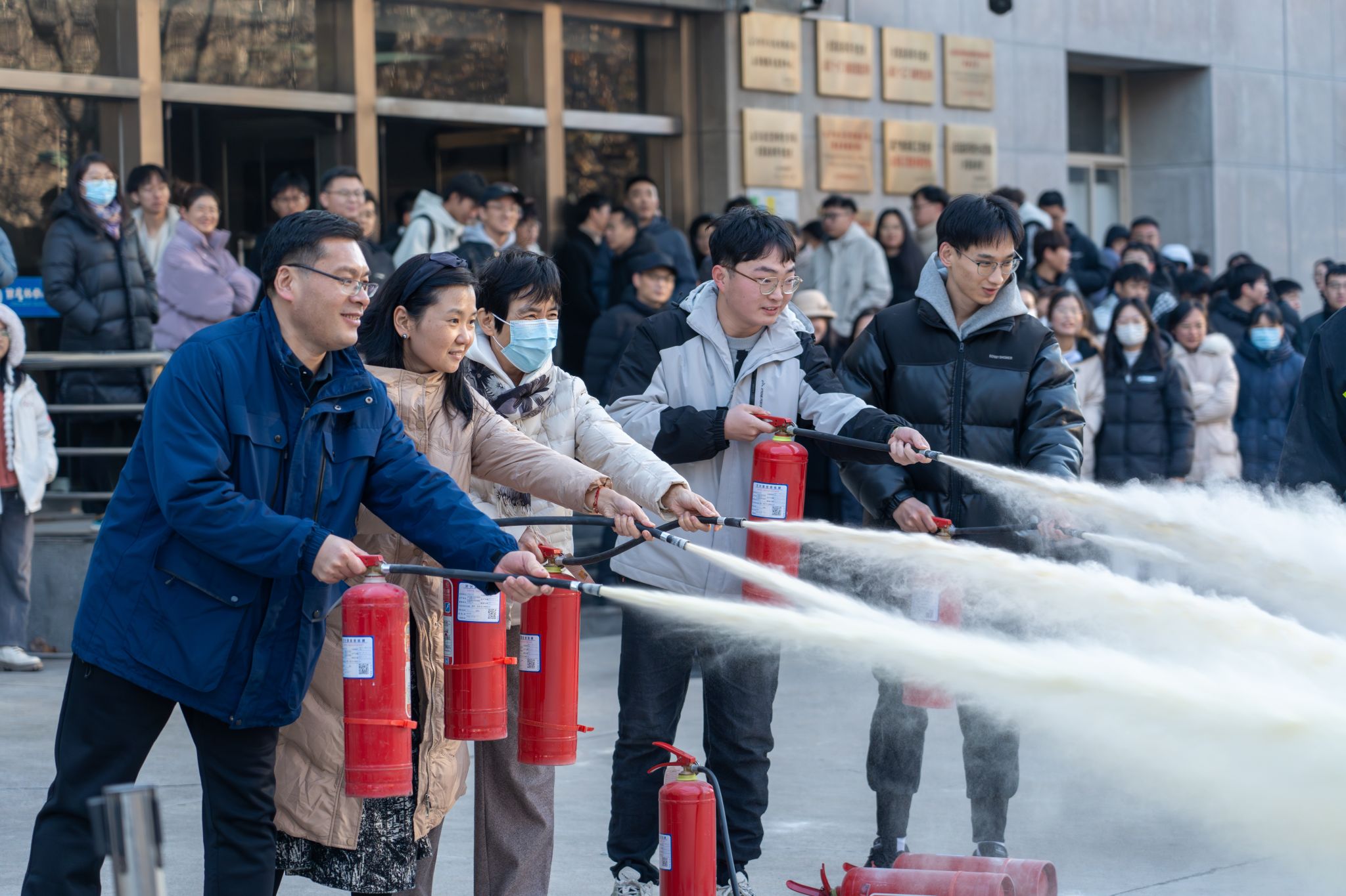 随着警报声响起,整个教学楼迅速进入应急状态。学院领导启动应急预案,拨打7110报警电话联系安全保卫处,切断楼内电源并组织教职工有序撤离。正在教学楼内的全体师生在志愿者的有序引导下,沿着预设的疏散路线快速撤离。仅用不到3分钟,全体人员便成功撤离至安全区域。随后,学院领导现场强调了加强安全工作、排查安全隐患、防范火灾等安全事故的重要性,提醒大家警钟长鸣。安全保卫处李鹏老师为教职工介绍了灭火器的不同类型、正确使用方法以及关键注意事项。师生们也积极地投入到灭火实操练习中。这次实操演练不仅直观展示了灭火器的效果,而且极大地增强了大家的灭火实战能力和应急自救水平。