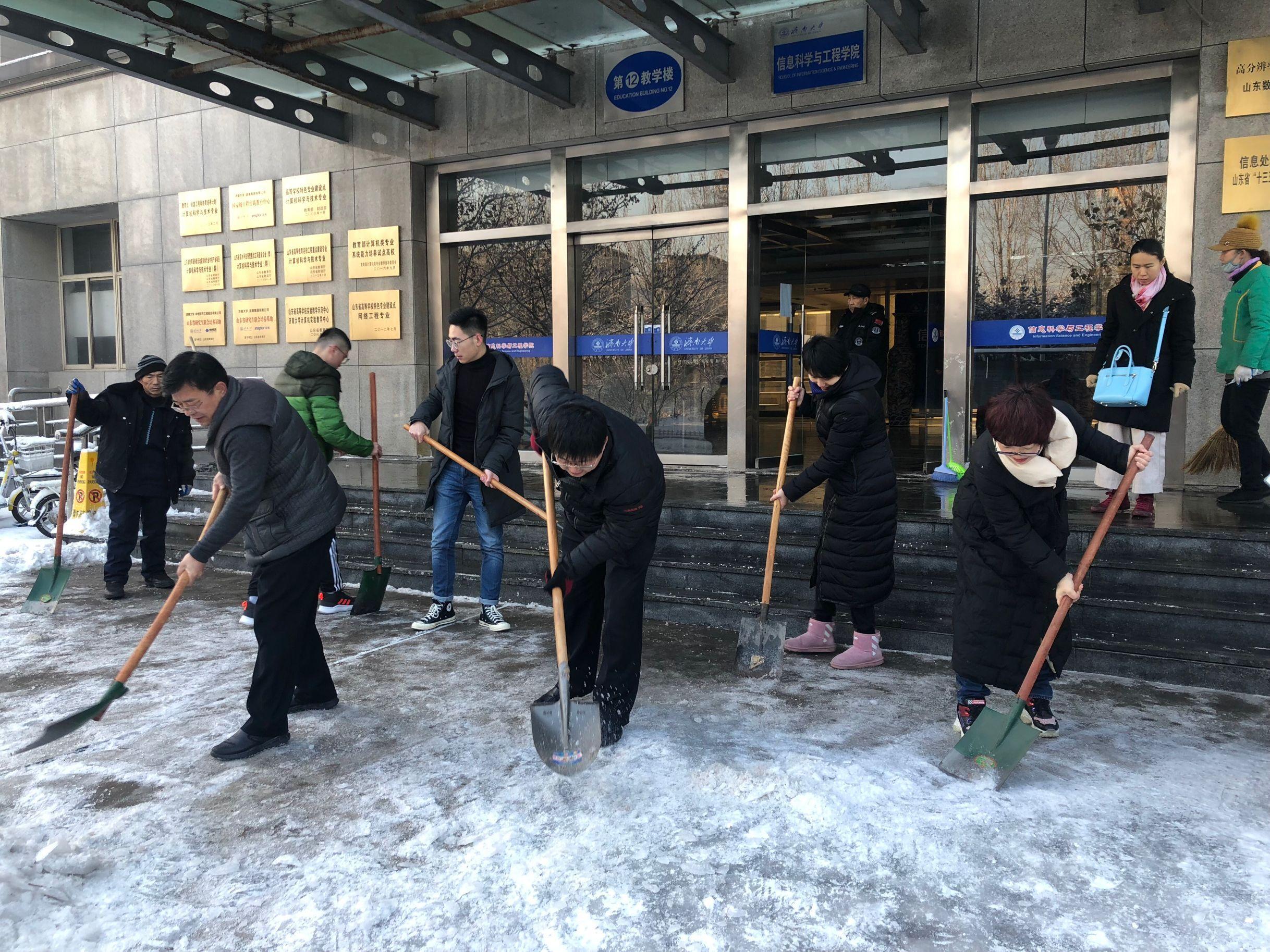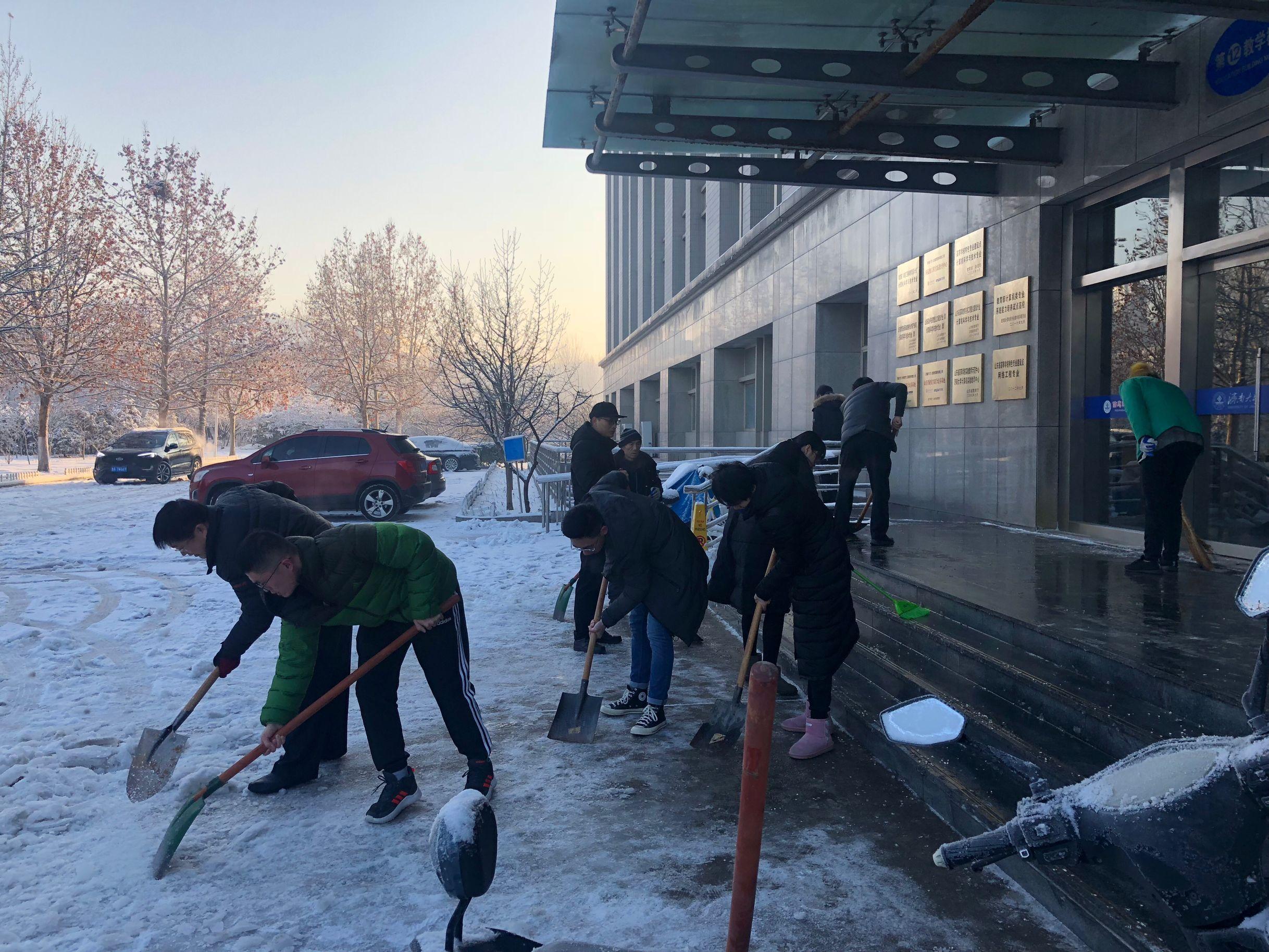 为确保师生安全,1月8日早上,我院领导班子带领学院部分教职工以及学生志愿者积极行动起来,开展扫雪除冰活动,清除学院主干道和周围积雪,方便师生出行。大家手拿铁锨、扫帚等工具,从教学楼前开始,依次沿楼前东西通道、教学楼北侧逐一清理积雪。扫雪现场,老师们齐心协力,配合默契,干得热火朝天。虽然室外温度很低,但大家劳动的热情和团结协作的力量让这个冬日变得格外温暖。经过大家的努力,学院周围道路上的积雪基本清扫干净,为全院师生开辟了一条洋溢着暖暖温情的方便之路,保证了全院师生的出行安全,也呈现出来自学院的温暖和人文关怀。