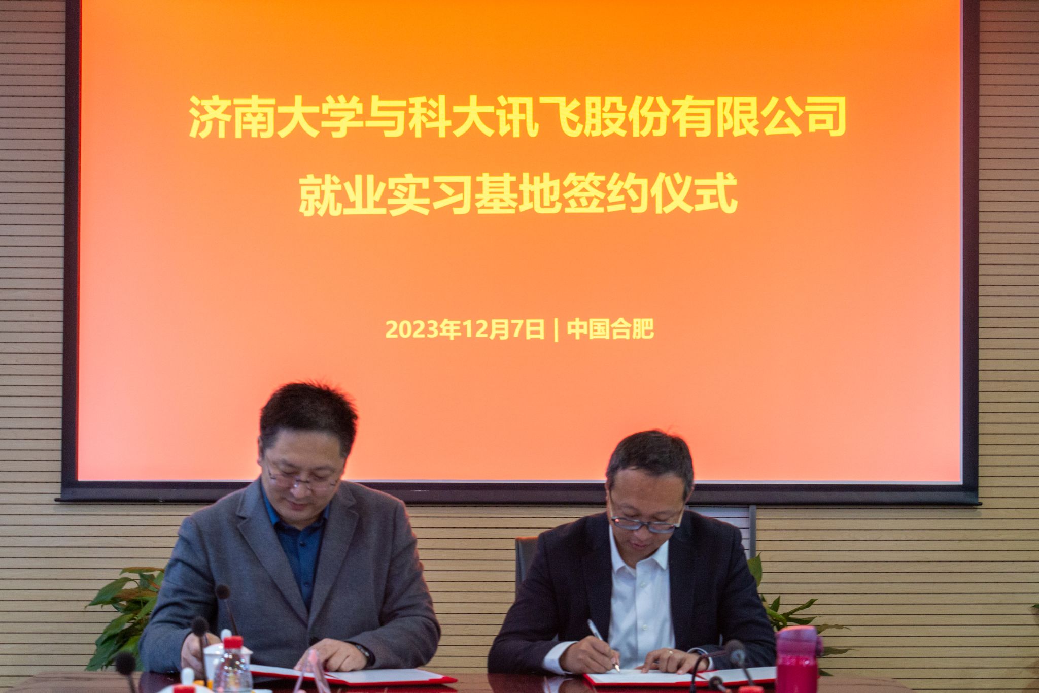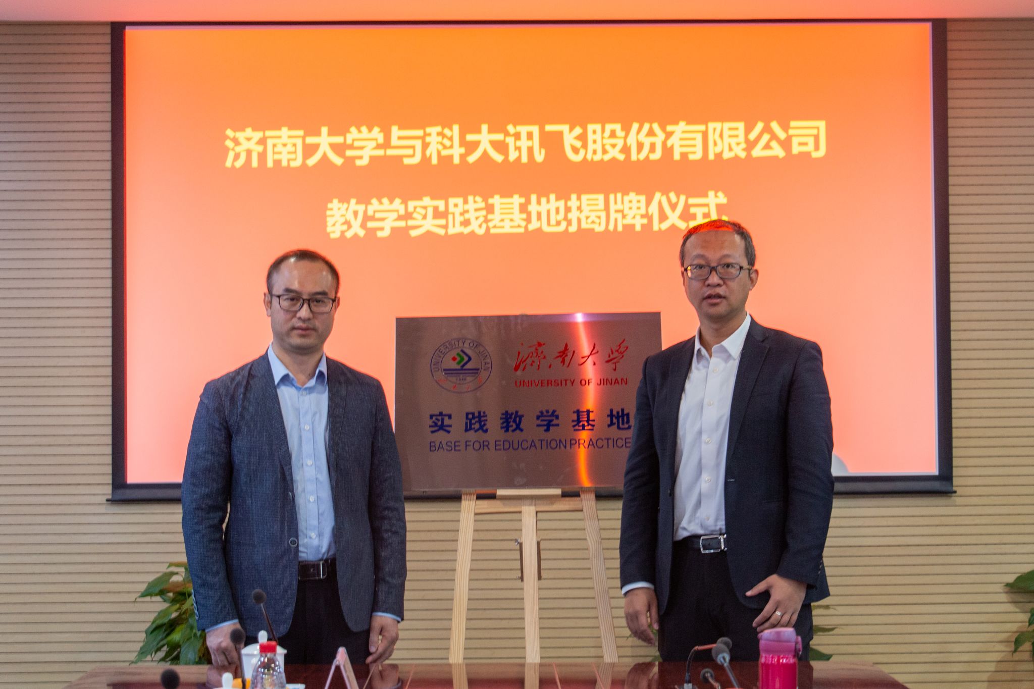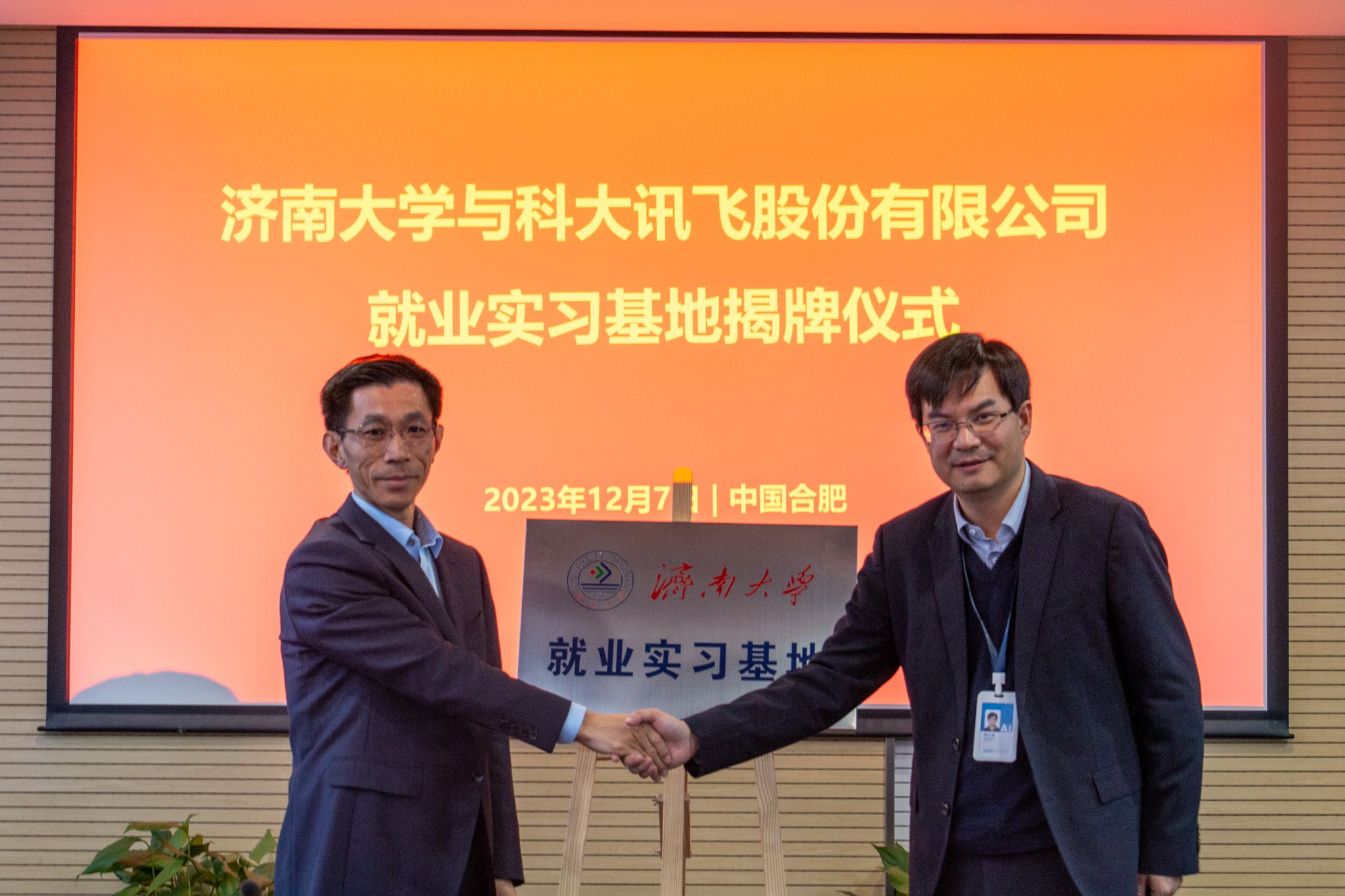 党委学生工作部(处)部(处)长卢旺代表学校与科大讯飞高教业务线山东区域总监李伯威签订《毕业生就业实习基地协议》,李强和陈红斌共同为“瘦猴探花