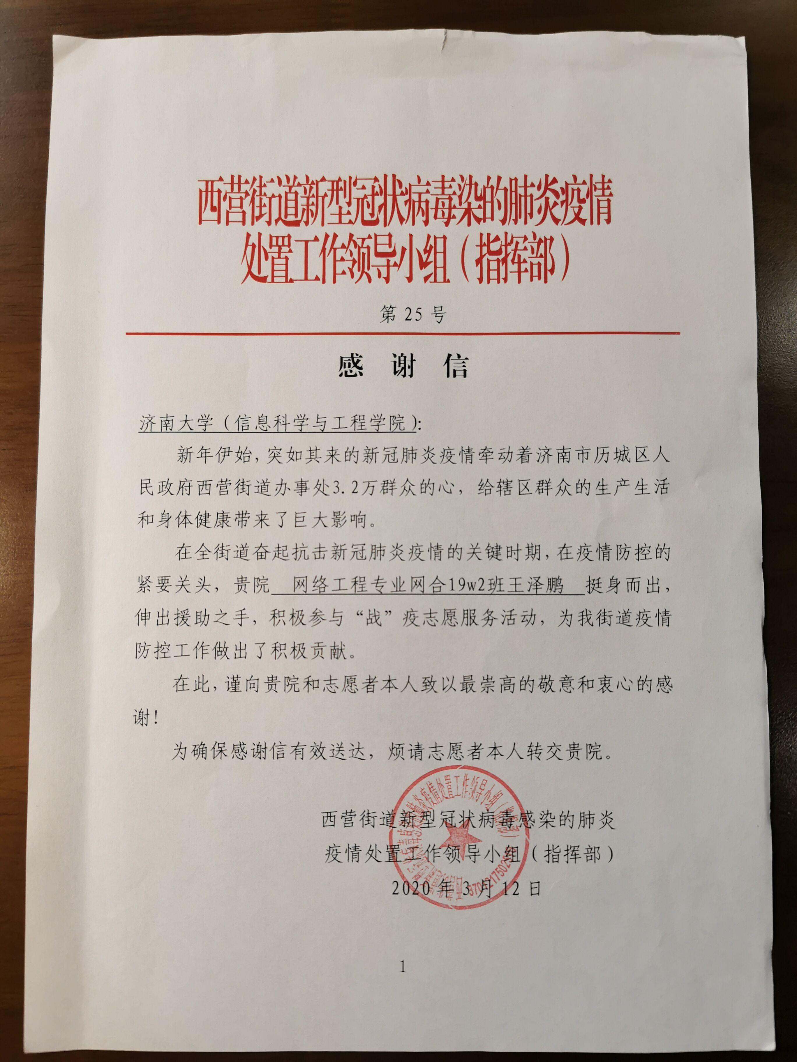 千灯共燃曜南北,众志成城克时艰。青年学子怀大爱,勇于担当战疫情。近日,济南大学信息科学与工程学院收到一封来自“济南市历城区西营街道新型冠状病毒感染的肺炎疫情处置工作领导小组(指挥部)”的感谢信,感谢我院返乡大学生网合19W2班王泽鹏为当地疫情防控工作作出的贡献,赞扬他在防疫一线勇于担当、勇于作为的奉献精神。