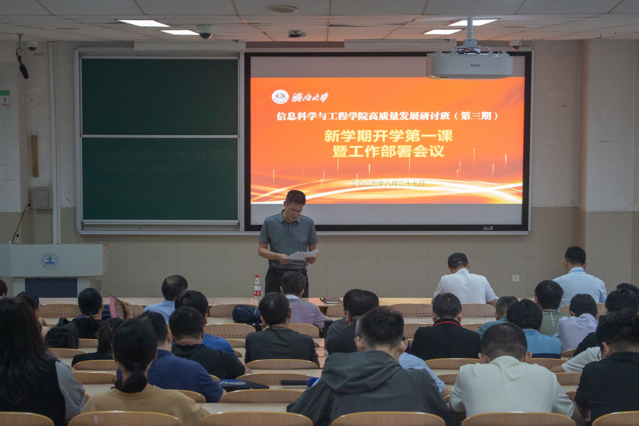 为全面贯彻落实立德树人根本任务,进一步凝聚共识、谋划新局,为新学期工作蓄势赋能,8月27日下午,信息科学与工程学院在11教5101召开新学期开学第一课暨新学期工作部署会。学院党政领导班子成员、全体教职员工参加会议,会议由学院党委书记夏卫东主持。