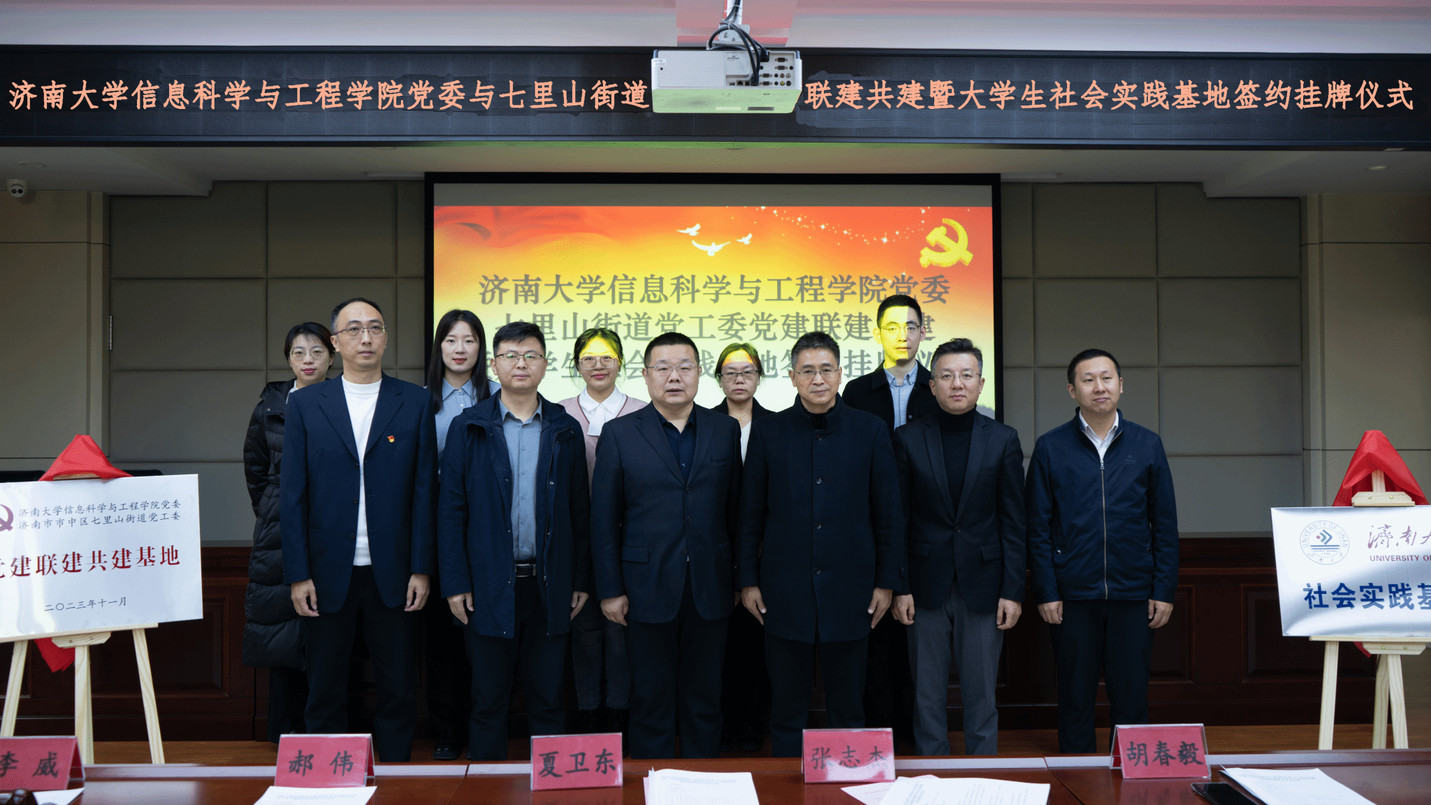 为了深入贯彻落实习近平新时代中国特色社会主义思想和党的二十大精神,积极响应团中央“百万大学生进社区”的号召,进一步推进校地融合、双向共建,搭建高校人才到基层实践锻炼平台,通过党建引领,共同探索基层治理新模式、新路径,11月30日上午,信息科学与工程学院与济南市市中区七里山街道党工委党建联建共建暨大学生社会实践基地签约挂牌仪式在七里山街道党群服务中心举行,共青团济南市市中区委书记党淼,济南市市中区七里山街道党工委书记张志杰,党工委副书记李威,党工委委员、办事处副主任隗娜,济南大学团委书记胡春毅,信息科学与工程学院党委书记夏卫东,党委副书记、副院长郝伟,七里山街道相关负责人,学院全体辅导员以及学生志愿者代表参加仪式。仪式由隗娜主持。