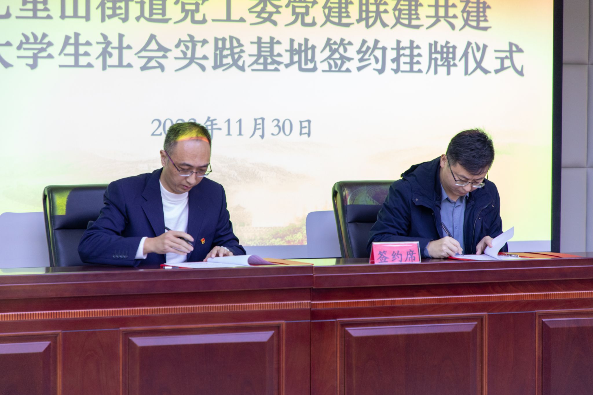 随后,郝伟与李威、隗娜分别签订《党建联建共建合作协议书》和《大学生社会实践基地协议》。夏卫东和张志杰共同为“党建联建共建基地”揭牌,胡春毅和党淼共同为“大学生社会实践基地”揭牌。同时,学院新学年“百万大学生进社区”社会实践工作启动。