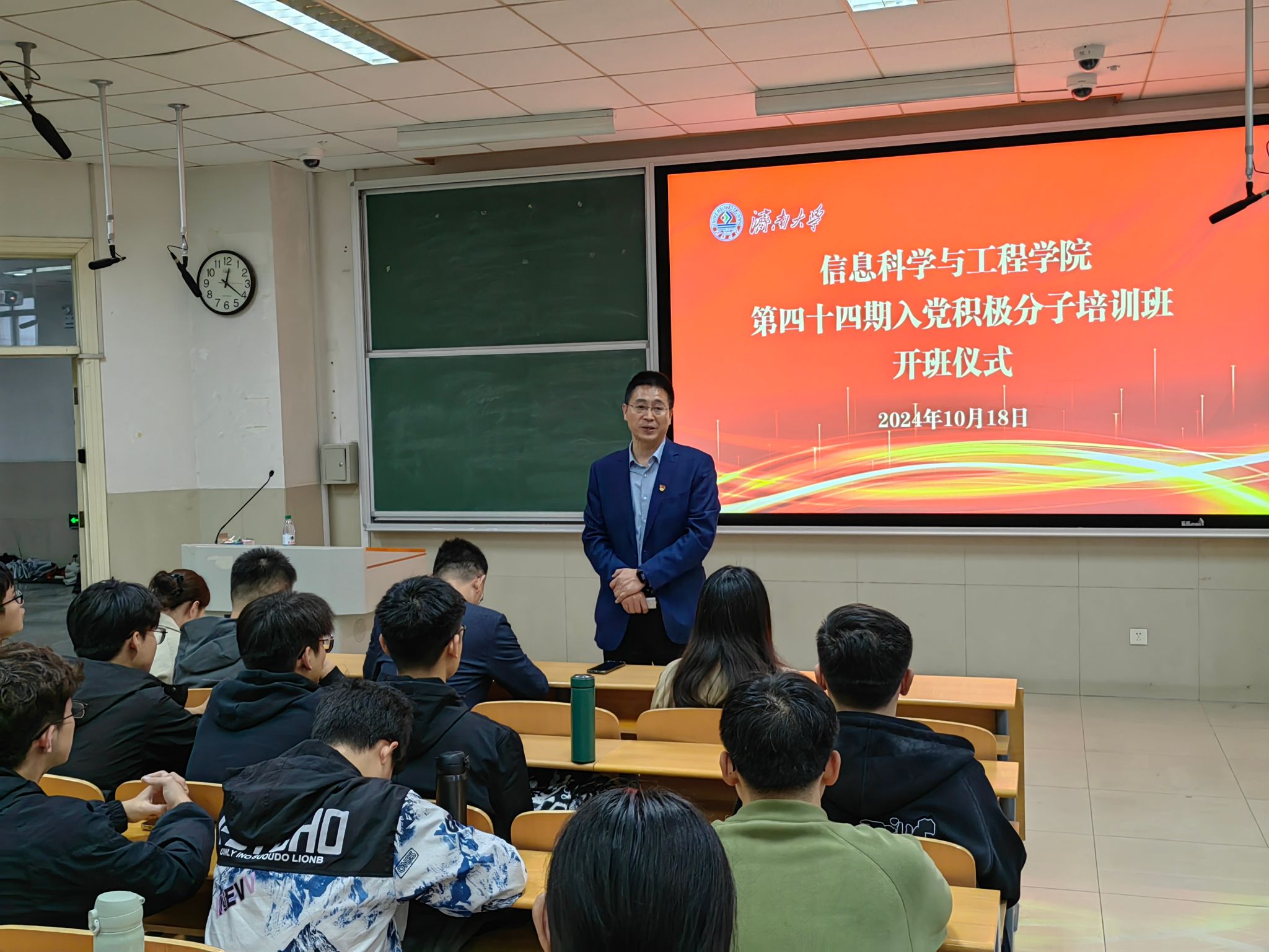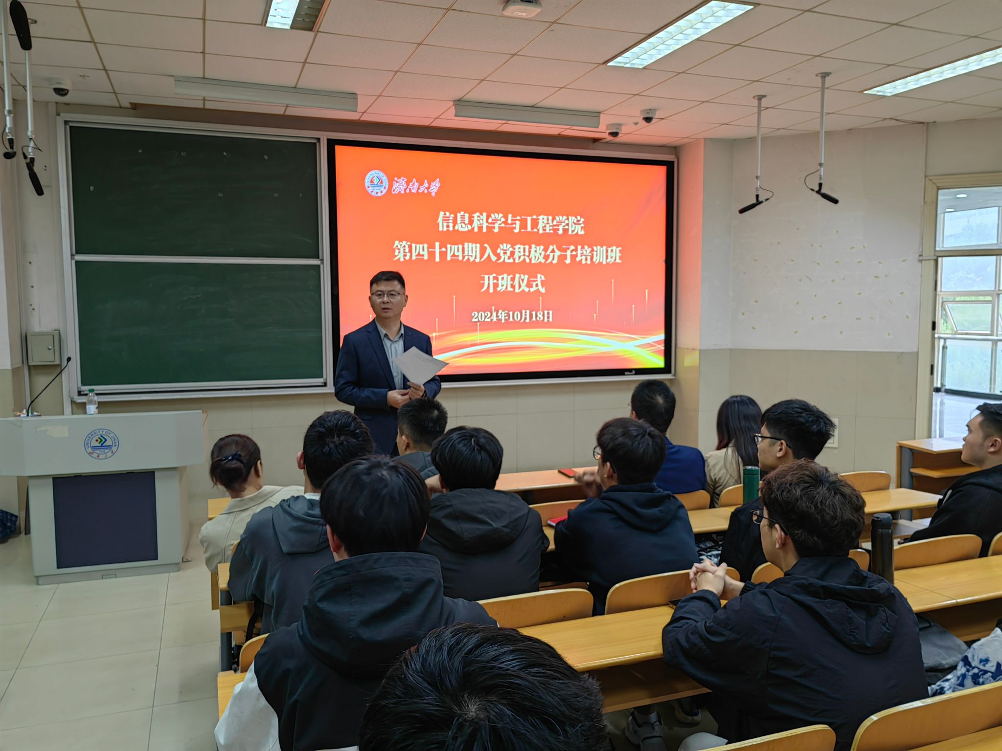 为进一步做好入党积极分子的教育培养工作,切实发挥党组织教育青年的作用,提升入党积极分子的综合素养,10月18日,信息科学与工程学院党委举行第44期入党积极分子培训班开班仪式。学院党委班子成员、组织员、学生党支部书记出席仪式,学院79名新确定的入党积极分子参加仪式。仪式由学院学生工作办公室主任付颖颖主持。