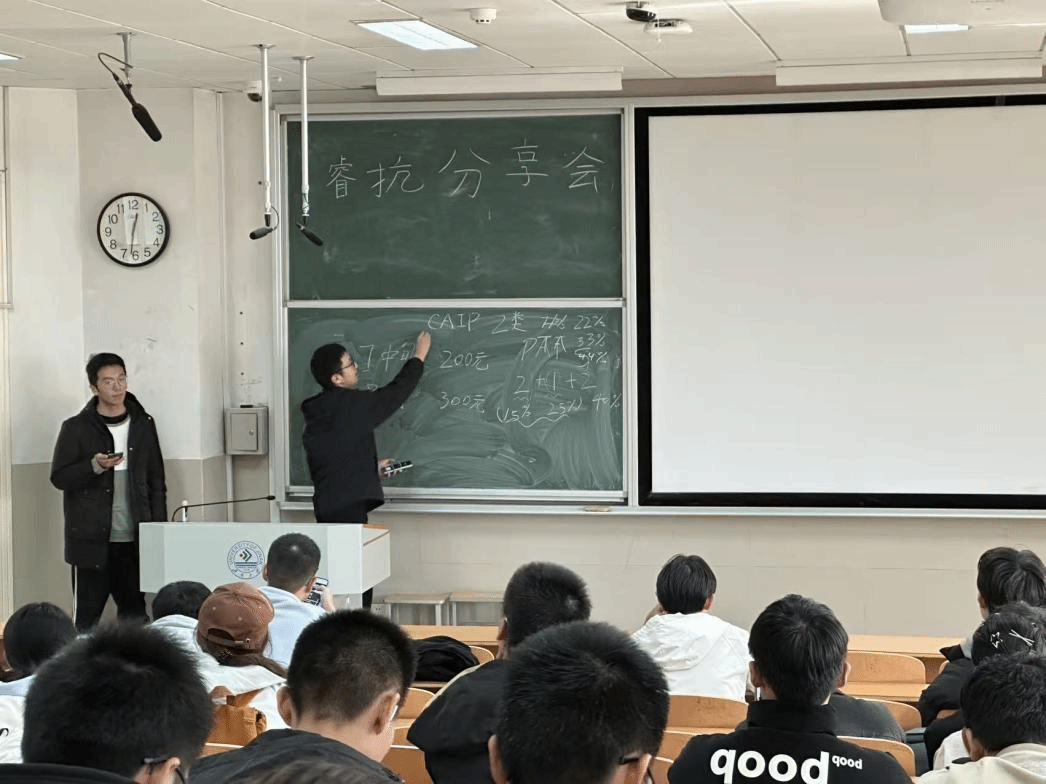 在经验分享会中,丁浩宇同学分享了自己如何与队友一起合作,为济南大学赢得了历史上的第一块icpc亚洲区域赛金牌。他强调,参加睿抗等算法比赛,坚持与努力尤为重要。张浩辰同学为同学们详细地介绍了睿抗大赛的赛制,编程环境和赛道划分等背景信息,拉近了同学们与大型科创赛事的距离。