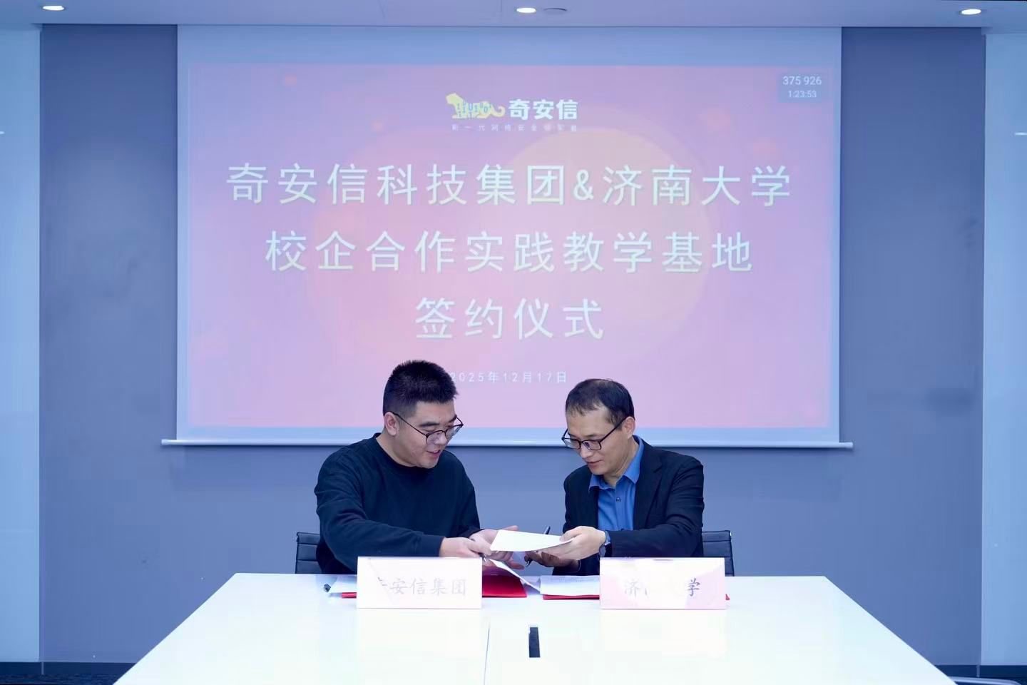 12月17日,济南大学教务处副处长张海鵾、信息科学与工程学院副院长荆山及网络空间安全专业负责教师代表一行,赴奇安信科技集团股份有限公司开展校企合作交流活动。双方共同签署了校企共建专业协议与校外实践基地协议,并围绕人才培养、实习就业、产学研融合等主题进行了深入座谈。
