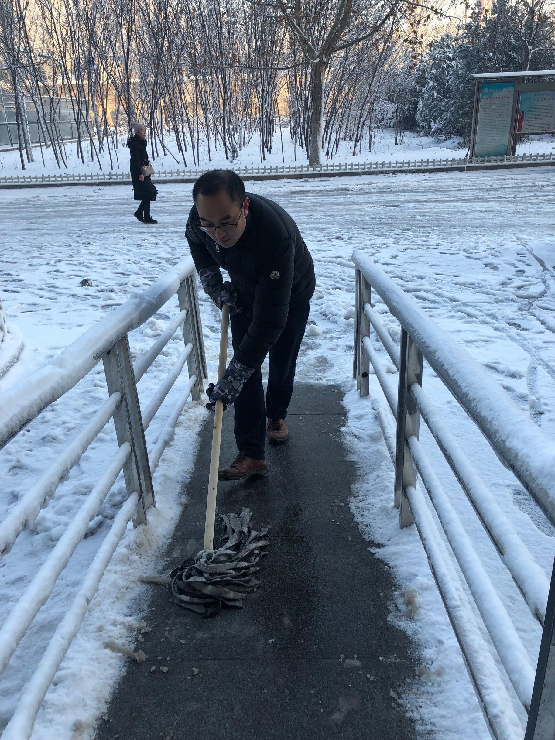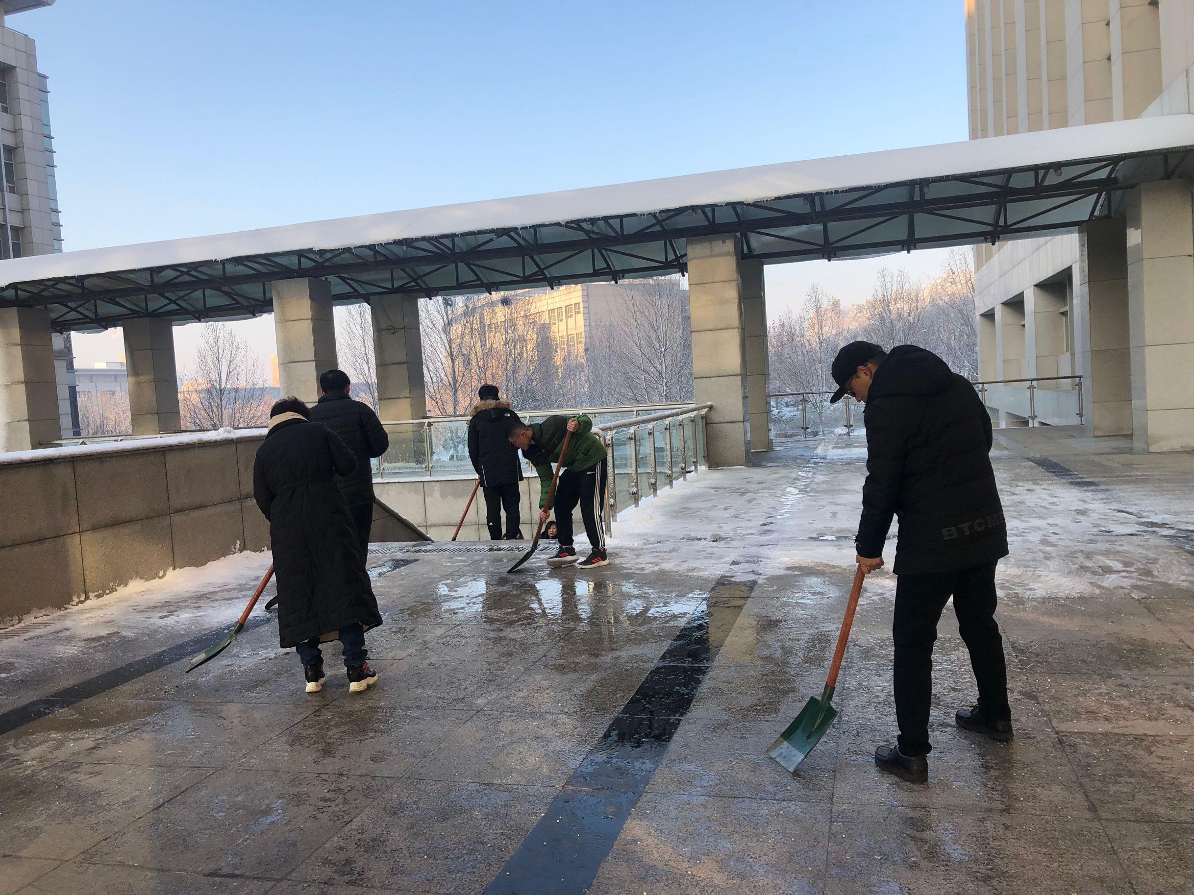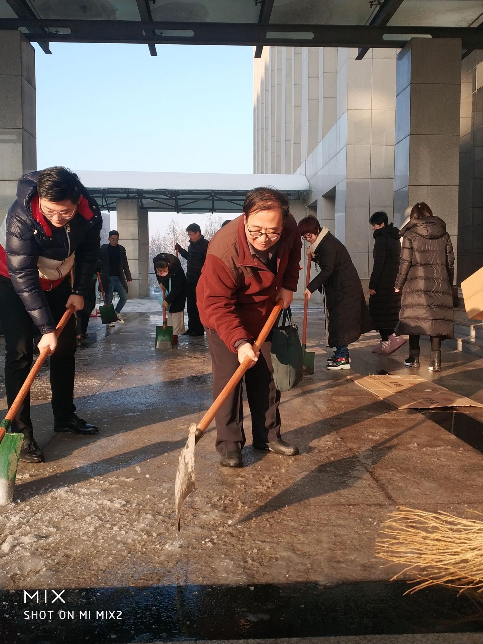 为确保师生安全,1月8日早上,我院领导班子带领学院部分教职工以及学生志愿者积极行动起来,开展扫雪除冰活动,清除学院主干道和周围积雪,方便师生出行。大家手拿铁锨、扫帚等工具,从教学楼前开始,依次沿楼前东西通道、教学楼北侧逐一清理积雪。扫雪现场,老师们齐心协力,配合默契,干得热火朝天。虽然室外温度很低,但大家劳动的热情和团结协作的力量让这个冬日变得格外温暖。经过大家的努力,学院周围道路上的积雪基本清扫干净,为全院师生开辟了一条洋溢着暖暖温情的方便之路,保证了全院师生的出行安全,也呈现出来自学院的温暖和人文关怀。
