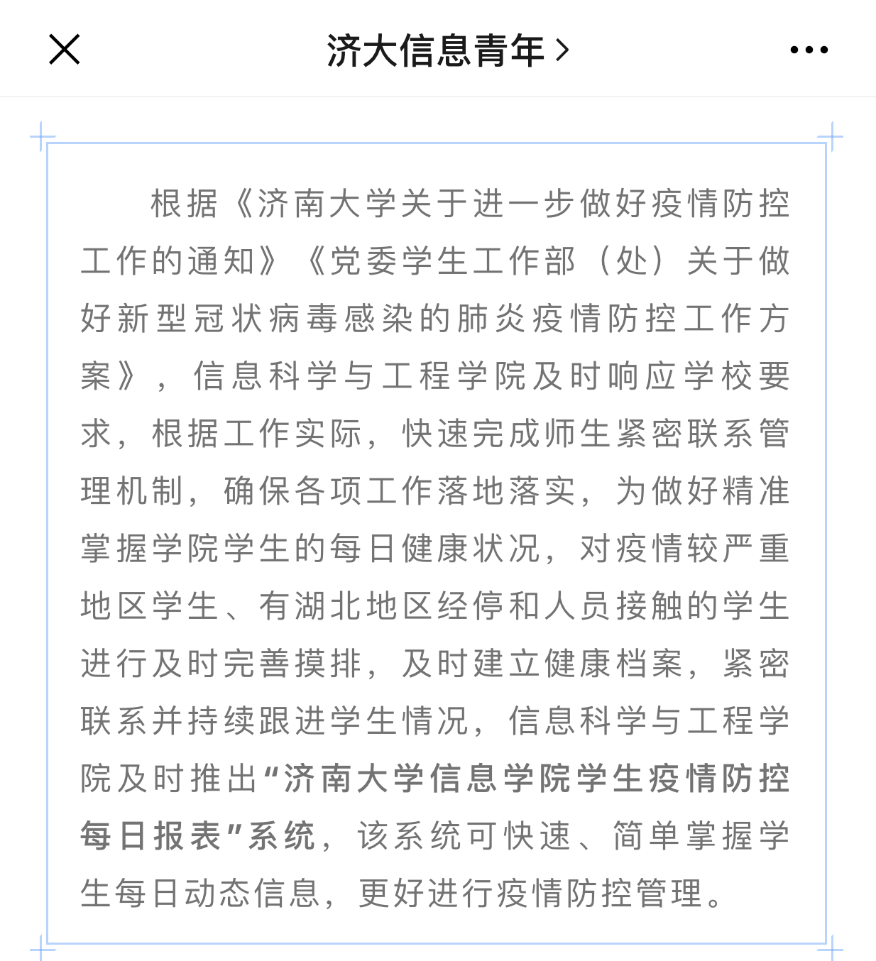 济南大学信息科学与工程学院认真贯彻落实习近平总书记重要指示精神,按照山东省教育厅《关于进一步做好新型冠状病毒感染的肺炎疫情防控工作的通知》、济南大学《关于做好新型冠状病毒感染的肺炎疫情防控工作的通知》和《关于成立济南大学新型冠状病毒感染肺炎疫情防控工作领导小组的通知 》相关部署要求,结合学院自身实际,迅速行动,积极投入疫情防控阻击战。
