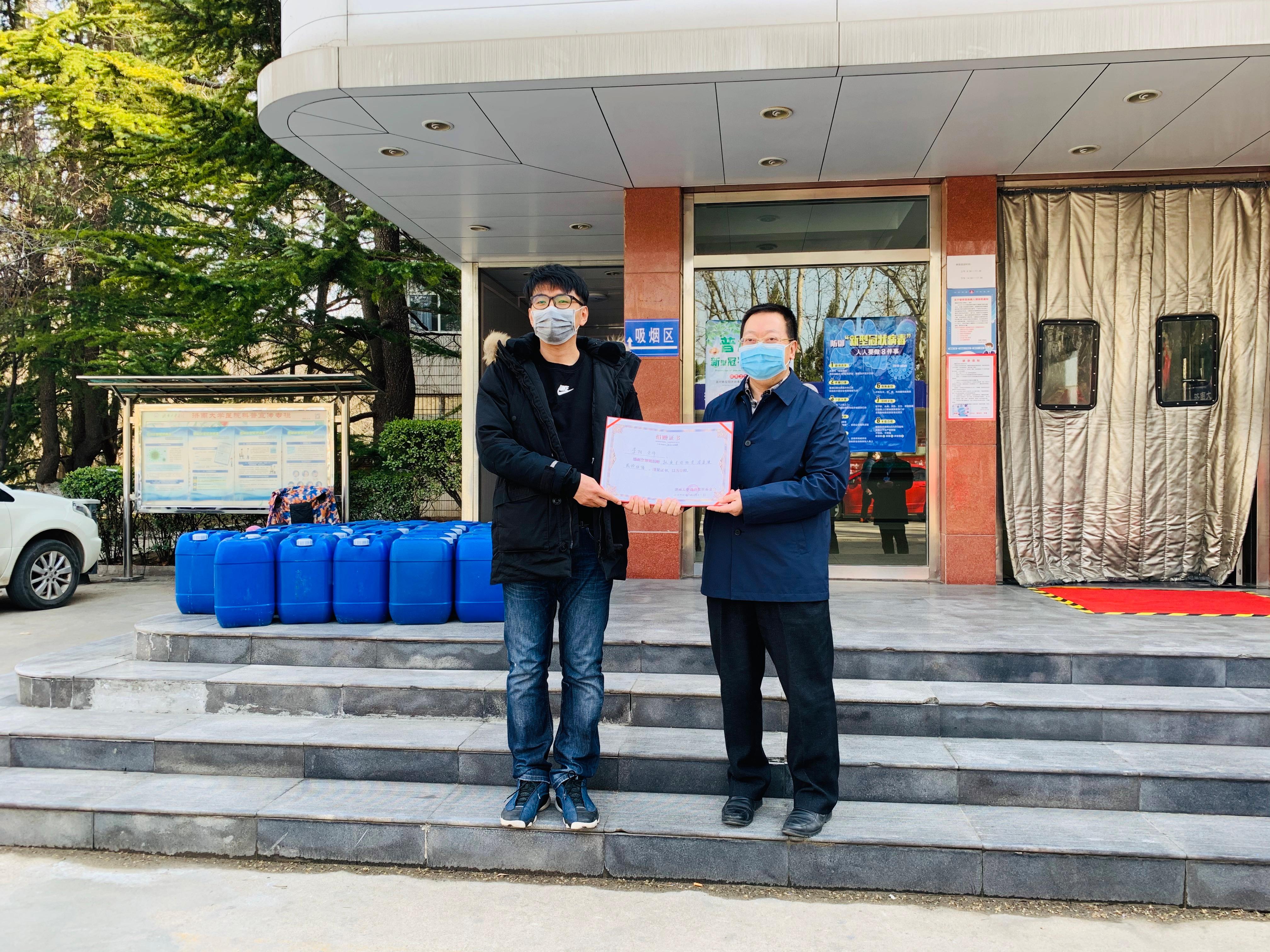 3月11日下午,济南大学信息科学与工程学院青年教师李阳向学校捐赠84消毒液25桶,用于支持学校疫情防控工作。济南大学副校长刘宗明、合作发展处处长卢旺、合作发展处副处长李仲涛、校医院副院长景中军、信息科学与工程学院党委书记邱鲁军、院长陈贞翔以及相关部门负责同志出席捐赠仪式。