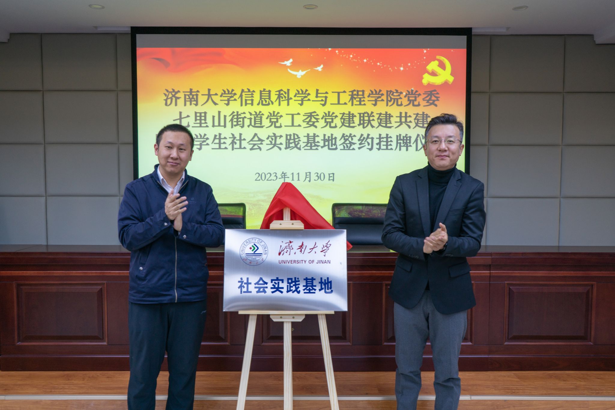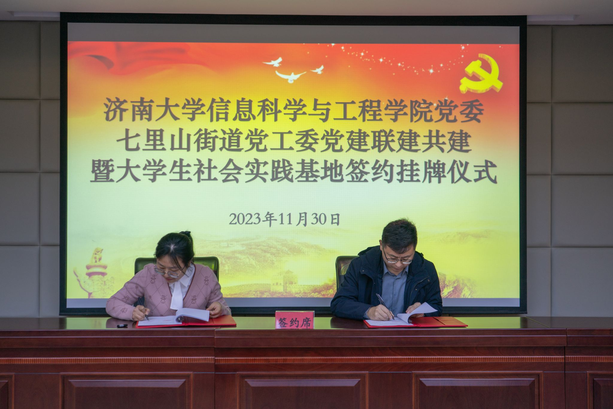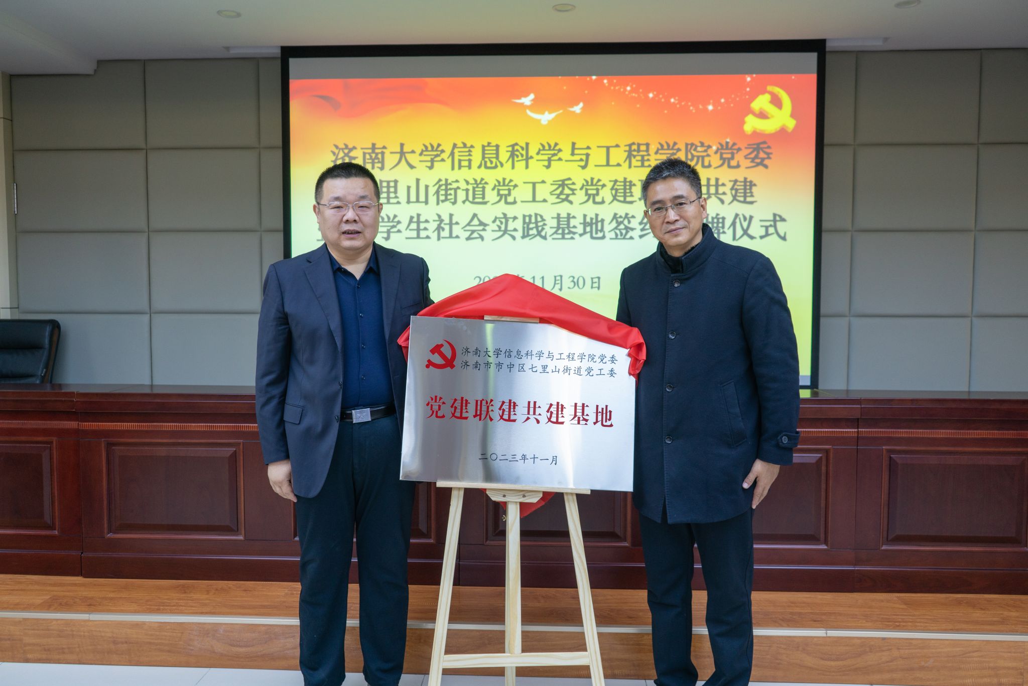 为了深入贯彻落实习近平新时代中国特色社会主义思想和党的二十大精神,积极响应团中央“百万大学生进社区”的号召,进一步推进校地融合、双向共建,搭建高校人才到基层实践锻炼平台,通过党建引领,共同探索基层治理新模式、新路径,11月30日上午,信息科学与工程学院与济南市市中区七里山街道党工委党建联建共建暨大学生社会实践基地签约挂牌仪式在七里山街道党群服务中心举行,共青团济南市市中区委书记党淼,济南市市中区七里山街道党工委书记张志杰,党工委副书记李威,党工委委员、办事处副主任隗娜,济南大学团委书记胡春毅,信息科学与工程学院党委书记夏卫东,党委副书记、副院长郝伟,七里山街道相关负责人,学院全体辅导员以及学生志愿者代表参加仪式。仪式由隗娜主持。