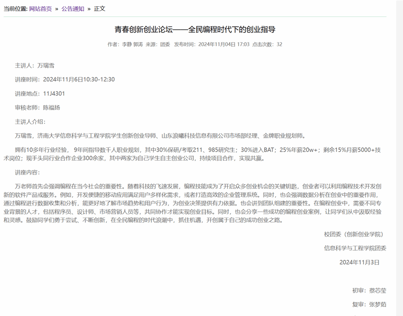 随着编程技术的普及和应用的不断拓展,信息科学与工程学院于2024年11月6日在11J4301举办了一场主题为“青春创新创业论坛——全民编程时代下的创业指导”的讲座。此次活动特别邀请了万瑞雪,一位在编程和创业领域具有深厚背景的专家,为学生们带来了一场充满洞见的分享会。