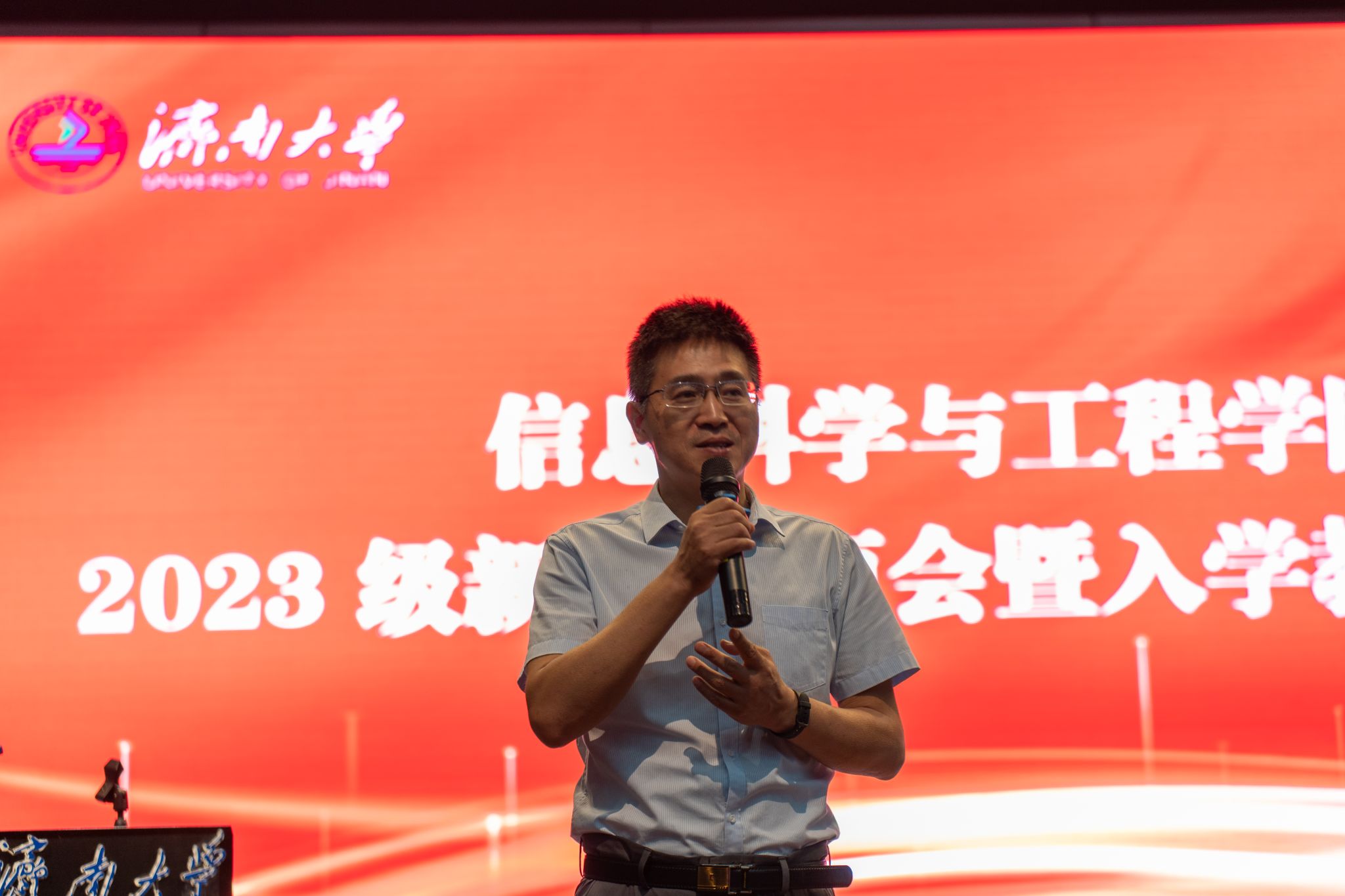 9月14日上午,信息科学与工程学院2023级新生见面会暨入学教育第一课在大礼堂举行。学院党委书记夏卫东,院长陈贞翔,党委副书记、副院长郝伟,副院长荆山,副院长杨晓晖,学生工作办公室相关老师以及2023级全体新生参加开学典礼。典礼由党委副书记、副院长郝伟主持。