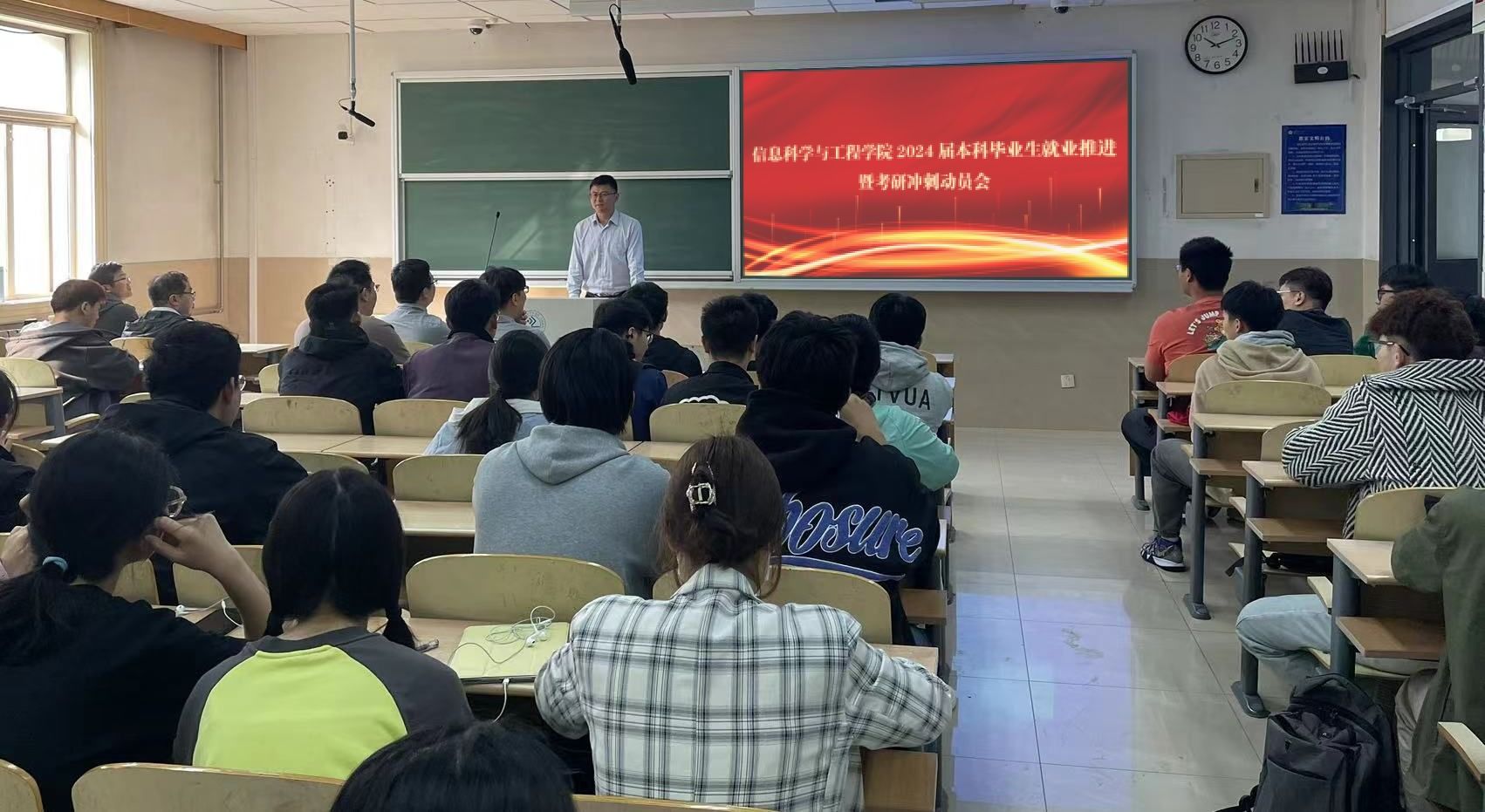 为推动我院本科毕业生社会就业及考研升学指导工作开展,10月25日上午,信息科学与工程学院2024届本科毕业生就业推进暨考研冲刺动员会于第十教学楼顺利召开。学院党委副书记、副院长郝伟,副院长杨晓晖,各系系主任,部分研究生导师及相关学工人员出席本次会议,2024届200余名本科毕业生代表参加会议。会议邀请山东大学李阳教授,学院集成电路系系主任张春伟副教授,计算机系牛四杰教授、夏英杰老师和王琳教授课题组在读博士宁帅作指导交流。动员会由2020级辅导员孟莹主持。